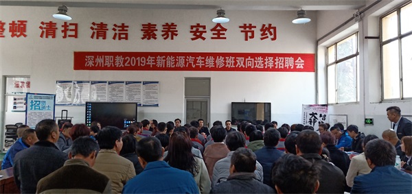 為拓寬學生就業渠道,搭建校企合作交流平台,2月28日,我校與北京彙智慧衆汽車技術研究院聯辦的“2019年新能源汽車維修班雙向選擇招聘會”在新能源汽修教學車間舉行。深州市教育局黨委委員、副局長李明月,我校黨總支書記、校長賀永帥,北汽新能源客戶中心運營主管翟鋆、人力資源經理湯磊、客戶中心質檢主管田美芳,北京彙智慧衆汽車技術研究院行政副院長李維年,北汽新能源華遠通達服務站總經理王碩出席招聘會。來自北京新能源汽車售後服務行業的十幾家企業代表、我校新能源汽修班學生及家長近百人參會。招聘會由賀林濤副校長主持。