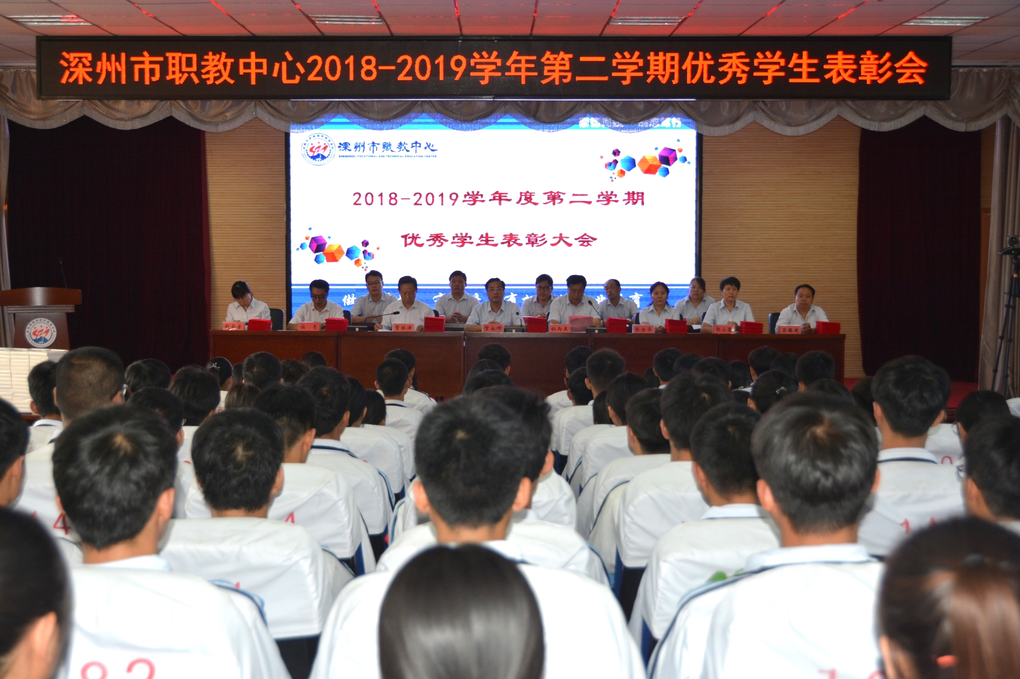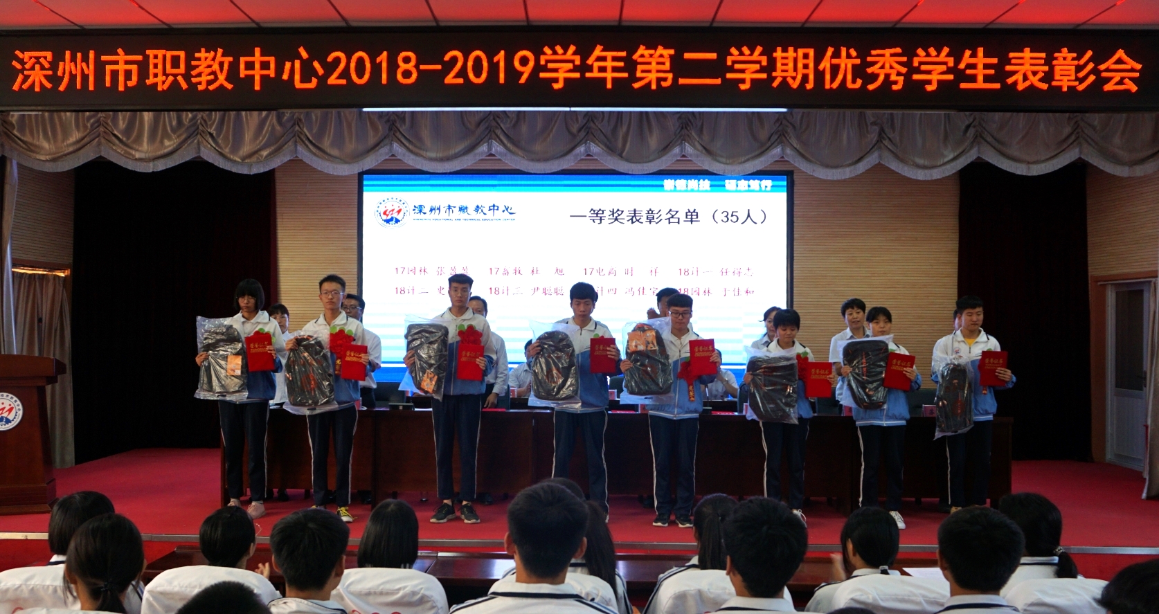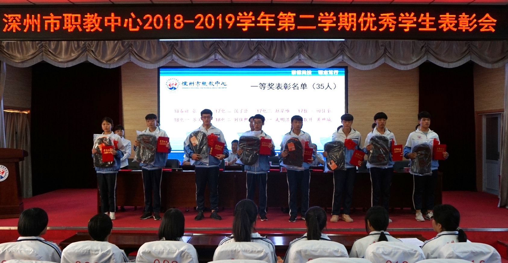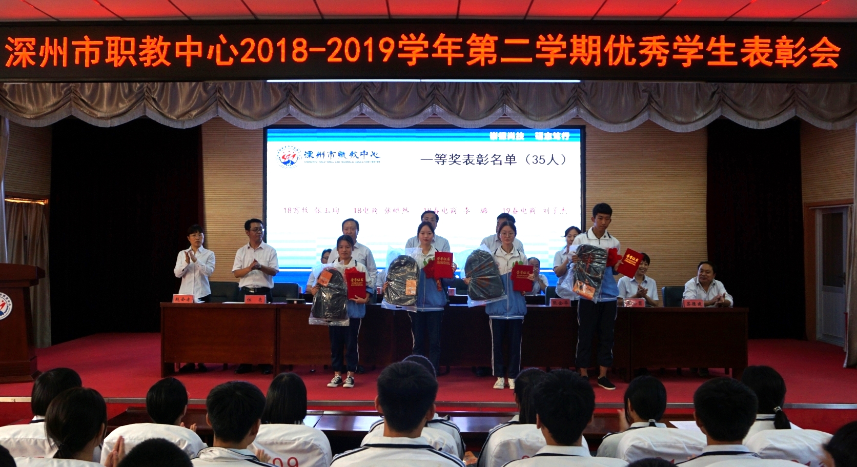 9月18日下午,金年会2018-2019學年第二學期優秀學生表彰大會在報告廳隆重舉行。學校黨總支書記、校長賀永帥,黨總支委員、副校長杜丙其、賀林濤出席會議,相關處(部)室主任主席台就坐,教工處、專業部相關人員,獲獎學生及高一年級學生代表近300人參加了大會。大會由賀林濤副校長主持。本次大會通過網絡進行現場直播,各班學生在教室同步觀看。