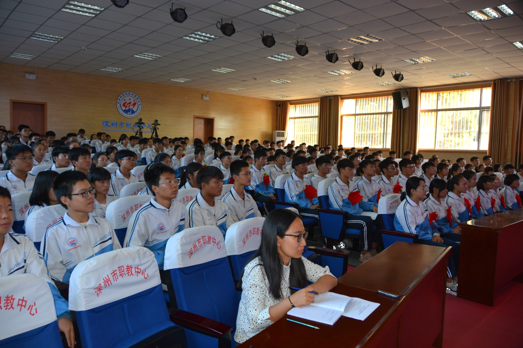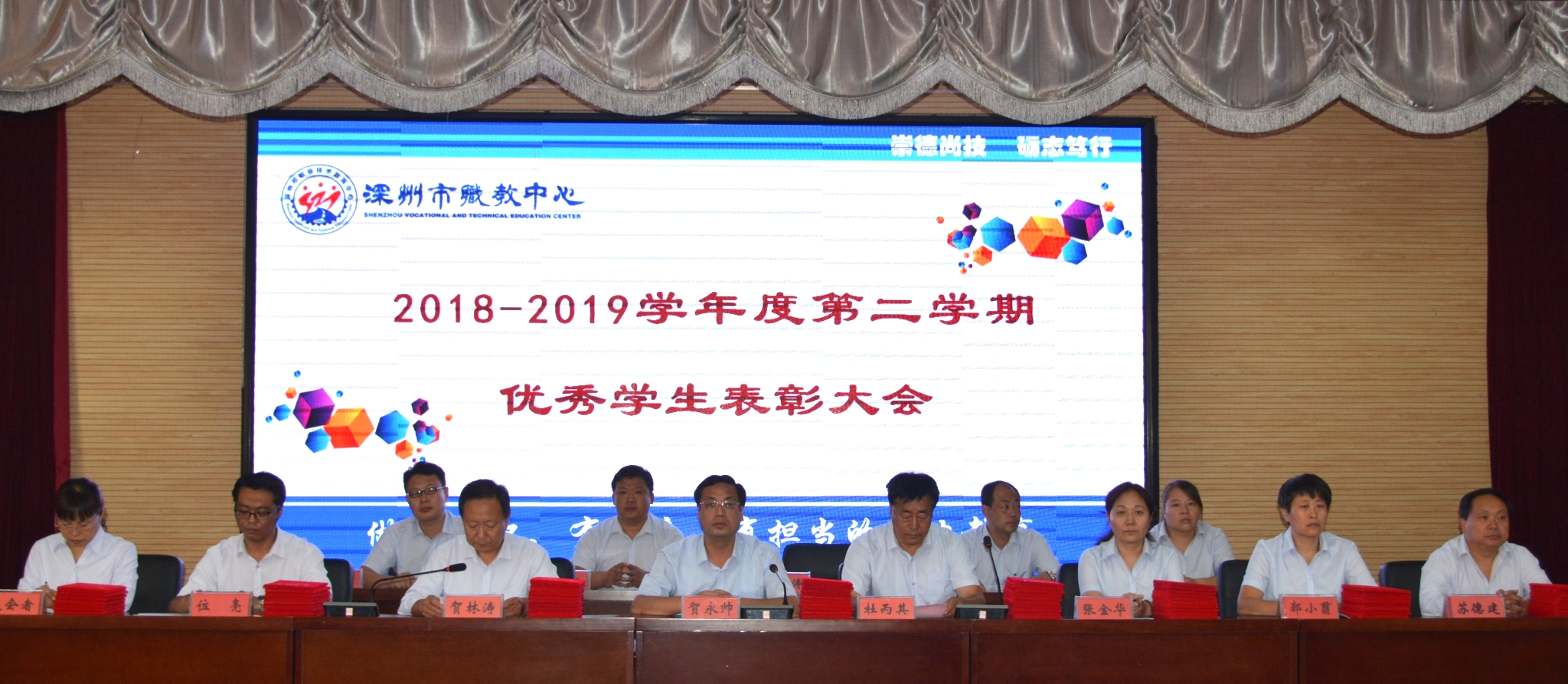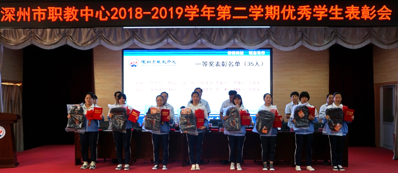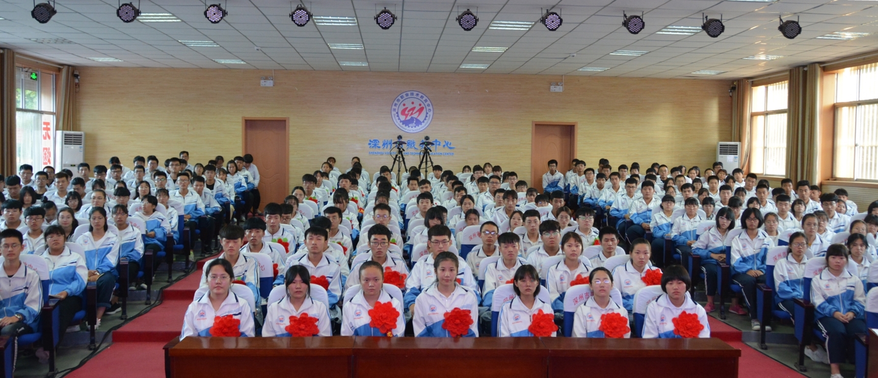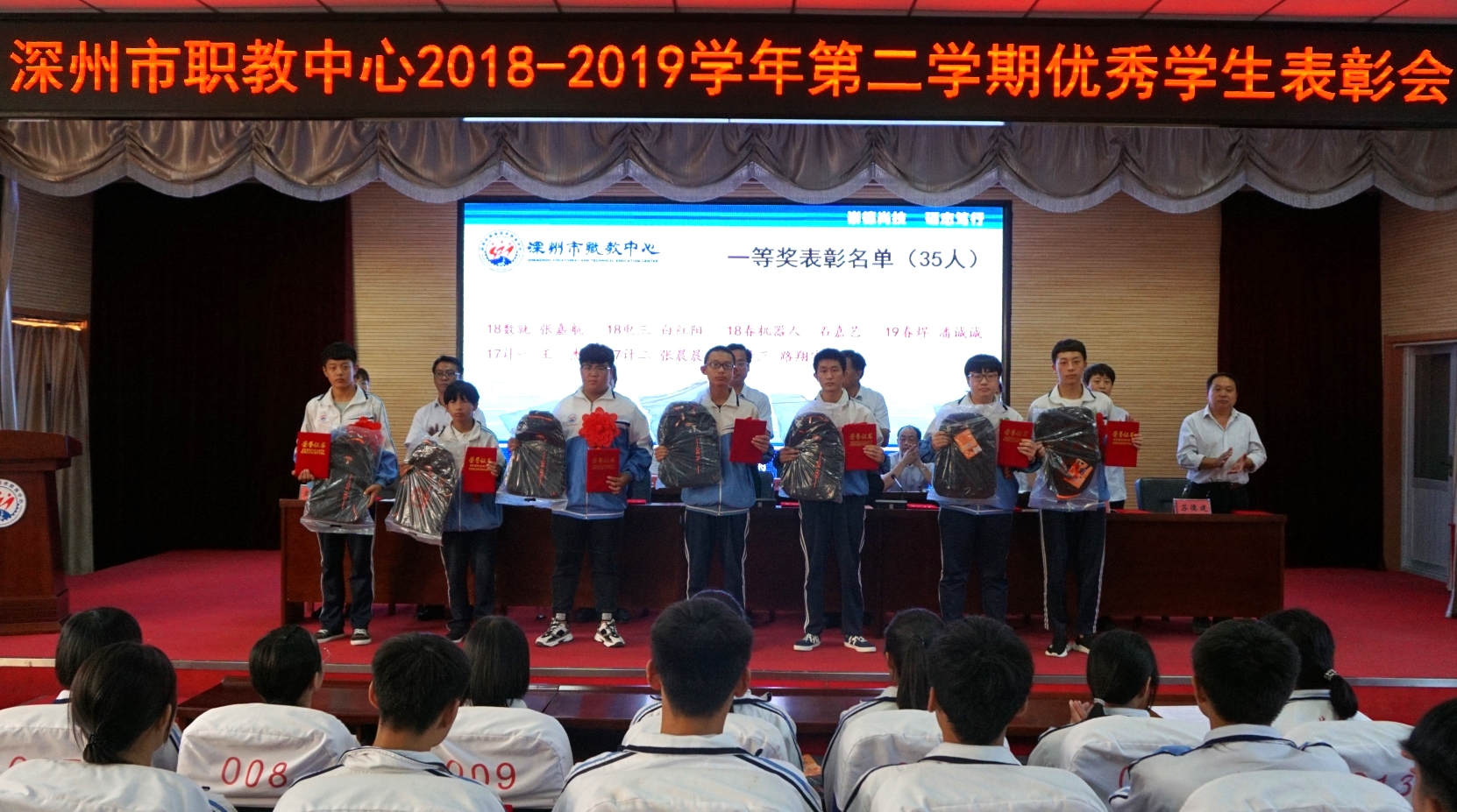 9月18日下午,金年会2018-2019學年第二學期優秀學生表彰大會在報告廳隆重舉行。學校黨總支書記、校長賀永帥,黨總支委員、副校長杜丙其、賀林濤出席會議,相關處(部)室主任主席台就坐,教工處、專業部相關人員,獲獎學生及高一年級學生代表近300人參加了大會。大會由賀林濤副校長主持。本次大會通過網絡進行現場直播,各班學生在教室同步觀看。