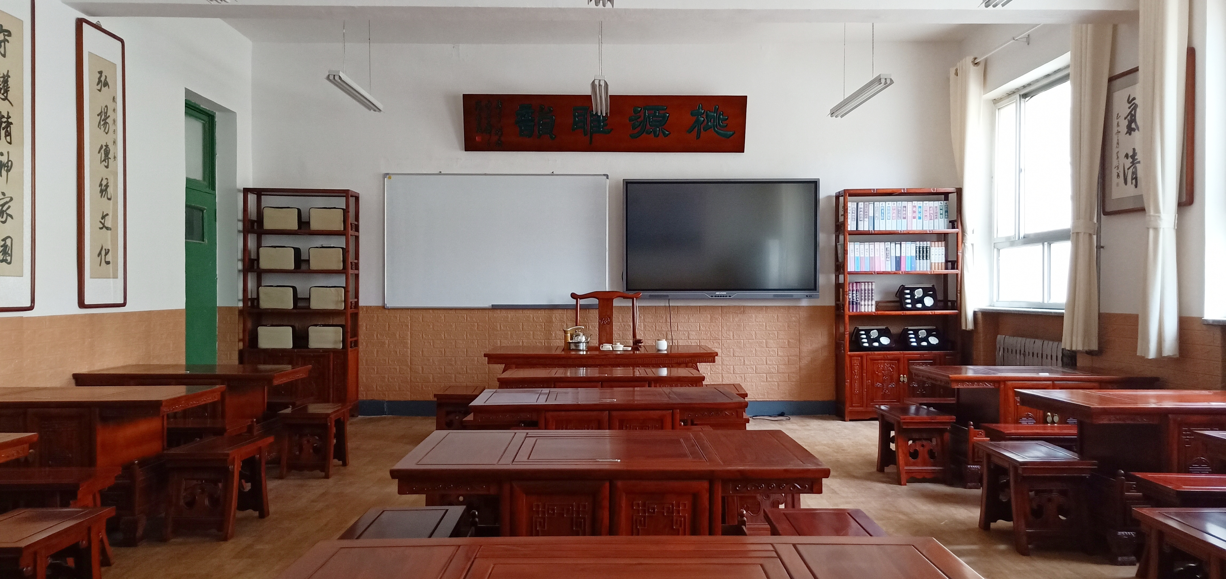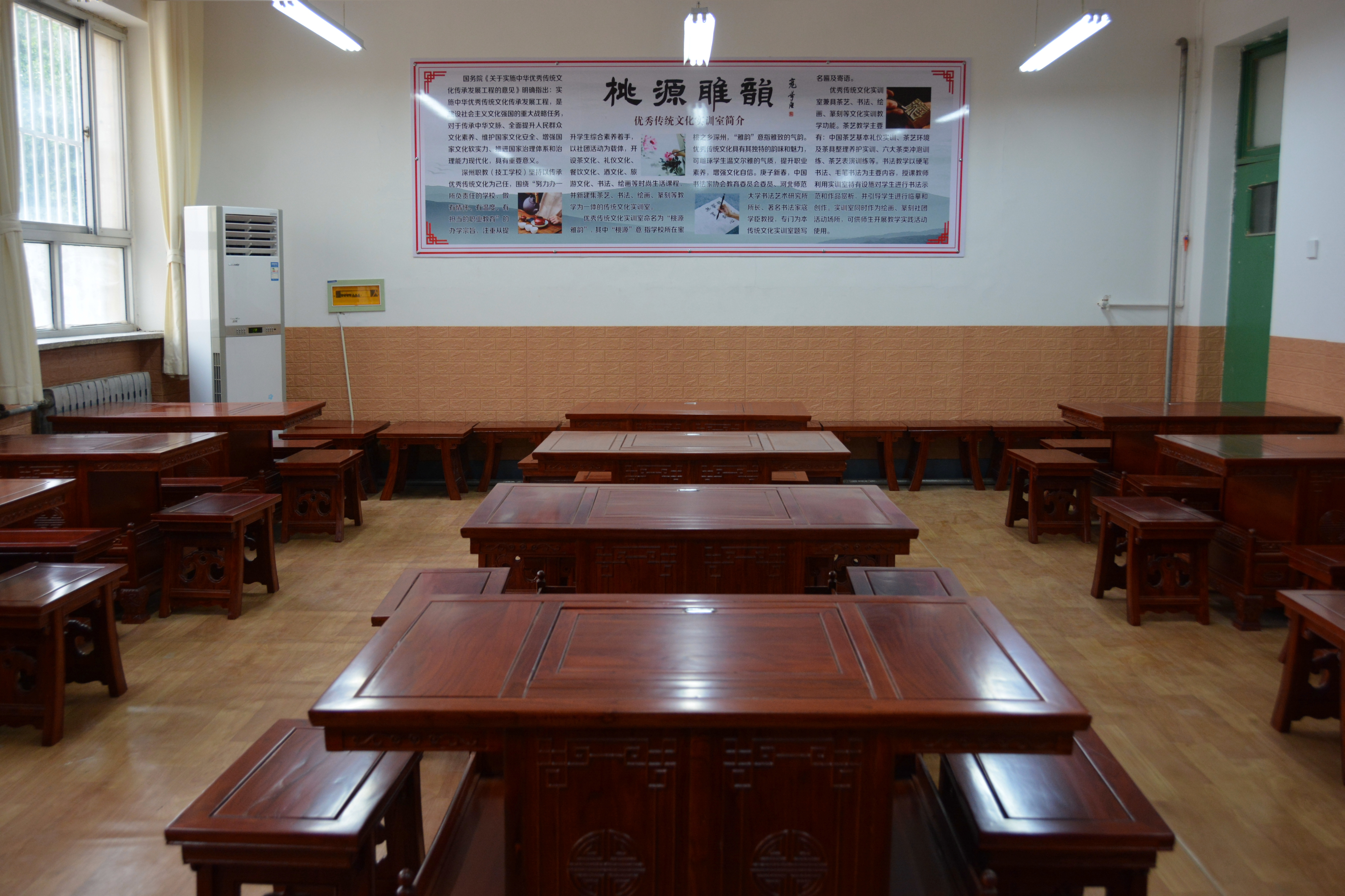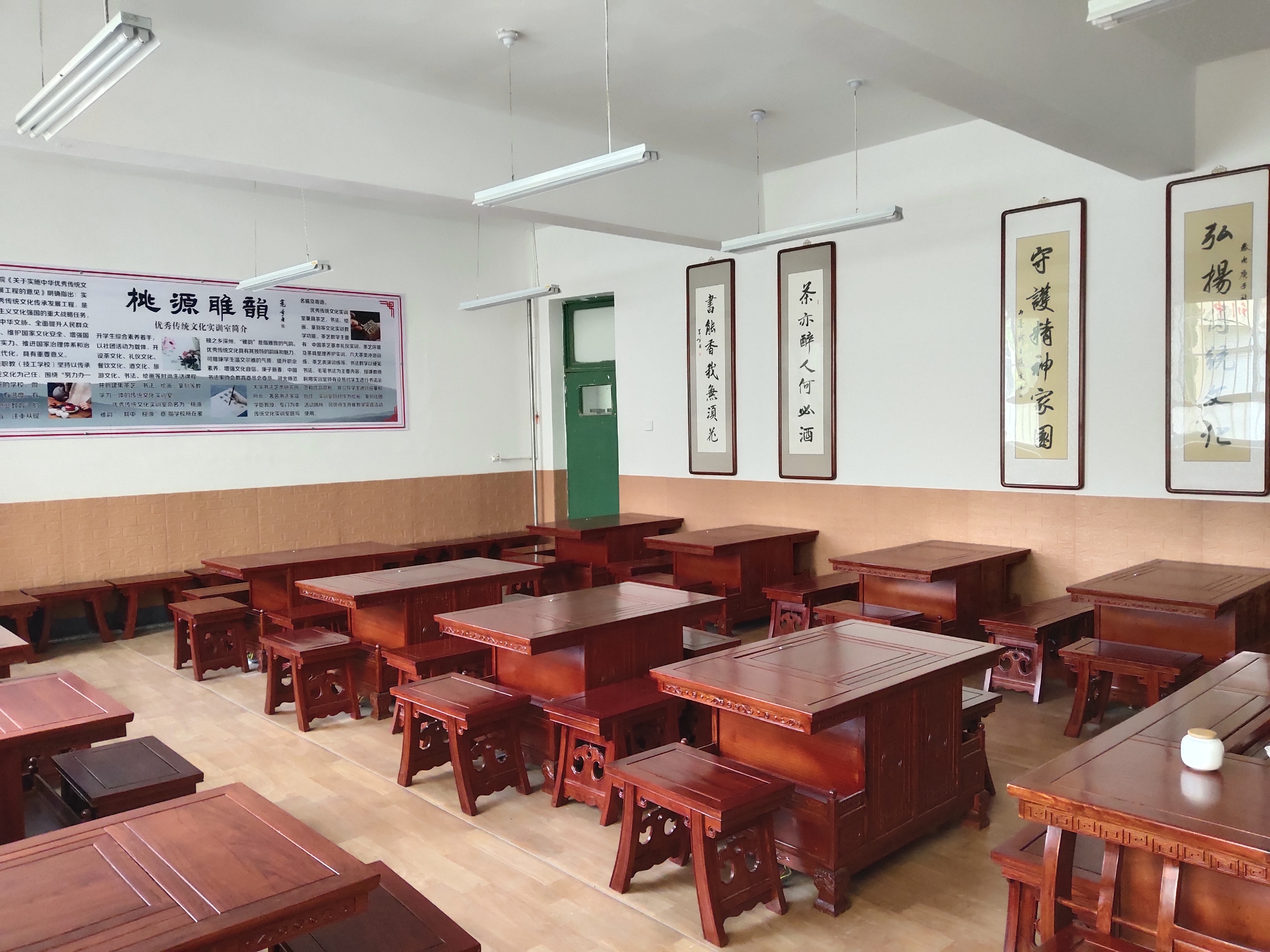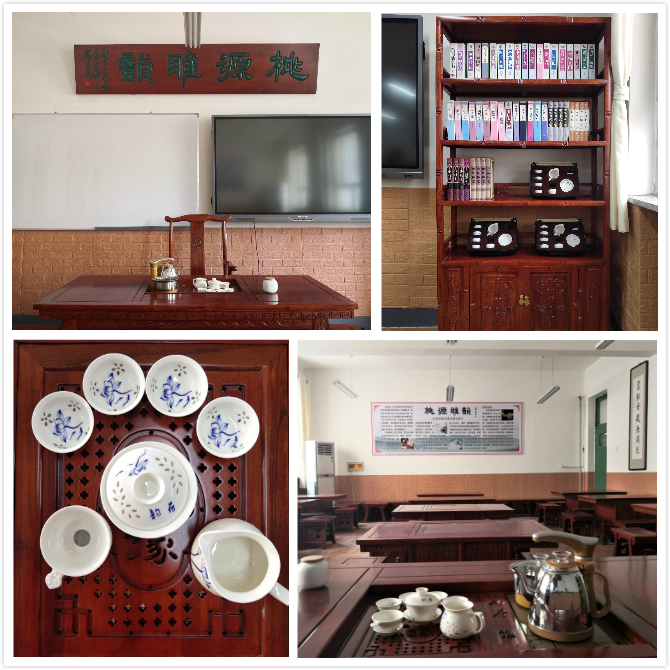 傳統文化實訓室命名為“桃源雅韻”,其中“桃源”意指學校所在蜜桃之鄉深州,“雅韻”意指雅緻的氣韻。優秀傳統文化具有其獨特的韻味和魅力,可雕琢學生溫文爾雅的氣質,提升綜合素養,增強文化自信。優秀傳統文化實訓室兼具茶藝、書法、繪畫、篆刻等實訓教學功能。茶藝教學主要有:中國茶藝基本禮儀實訓、茶藝環境及茶具整理養護實訓、六大茶類沖泡訓練、茶藝表演訓練等。書法教學以硬筆書法、毛筆書法為主要内容,授課教師利用實訓室特有設施對學生進行書法示範和作品賞析,并引導學生進行臨摹和創作。實訓室同時作為繪畫、篆刻等社團活動場所,可供師生開展教學實踐活動使用。