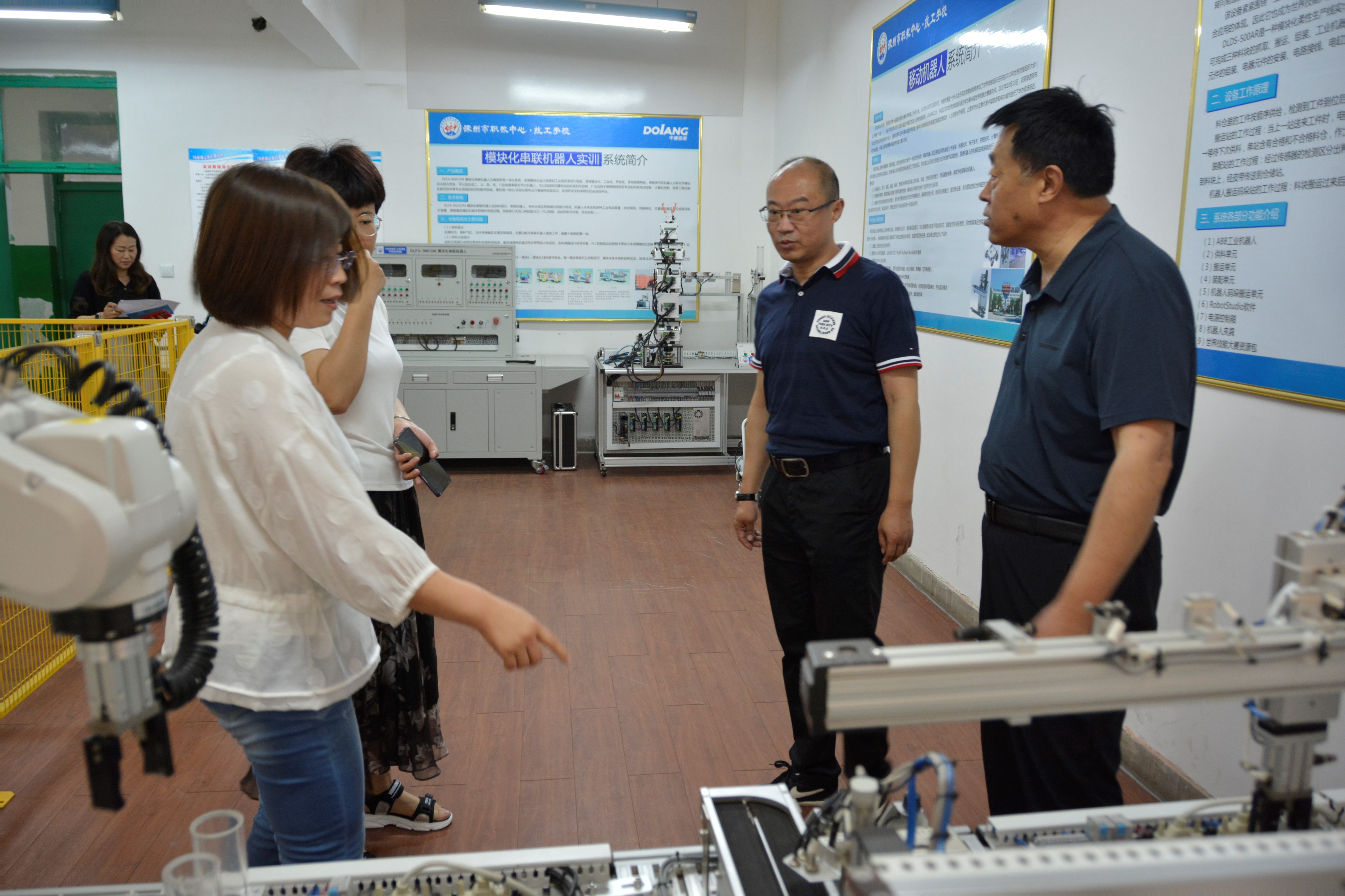 張愛學校長首先對兄弟學校來訪表示熱烈歡迎,簡要介紹了深州市經濟發展現狀及學校專業教學、德育建設、社會培訓等情況,并與保定四職中客人就新能源汽車維修專業建設進行了交流,同時希望雙方增進往來,學習互鑒,共同為職業教育發展貢獻力量。吳畏副校長簡要介紹了保定四職中學校情況,并就物聯網(智能家居)專業教育教學、課程設置、設施設備、實訓操作等進行了深入溝通研讨。随後,在杜丙其副校長的陪同下,來訪客人參觀了智能家居實訓基地、電工專業實訓室、3D打印實訓室、工業機器人實訓室、網絡信息安全實訓室等實訓設備和校園設施,并對我校專業建設與發展給予了充分肯定。